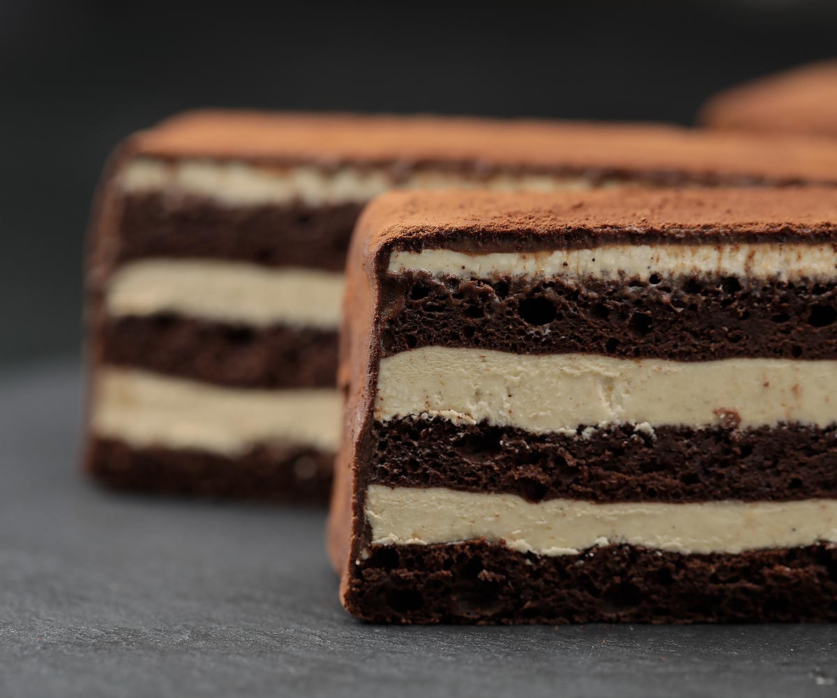 フランス産カカオパウダーだけで焼き上げた生地に、北海道産の100%フレッシュバターをふんわりホイップして作ったヘーゼルナッツ風味のバタークリームを層にして挟みました。